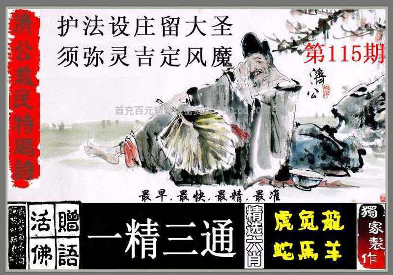 115期:济公特码诗:护法设庄留大圣,须弥灵吉定风魔(开:蛇01)解:护法设庄留大圣,须弥灵吉定风魔,解肖虎兔龙蛇马羊 九肖:猪羊蛇牛猴马虎兔龙 六肖:猪羊蛇牛猴马 三肖:猪羊蛇